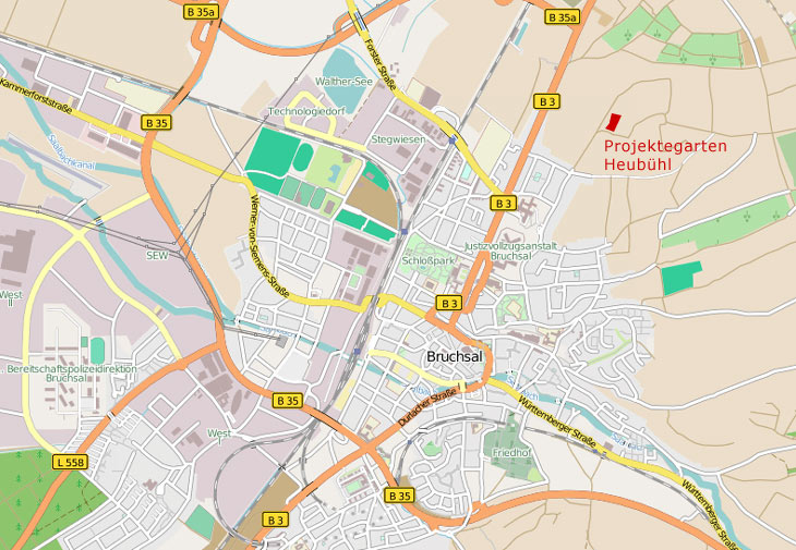 Folgen Sie der B3 nach Heidelberg. Nach der Strafvollzugsanstalt und dem Krankenhaus biegen Sie in die letztmögliche Straße rechts ein (Haydnstraße). Die dritte Straße rechts ist auch schon der Mozartweg, wo Sie Ihr Auto abstellen können. Von hier aus sind es nur etwa 4 Gehminuten zum Projekte-Garten (hierfür links einbiegen und den Fußweg nehmen).