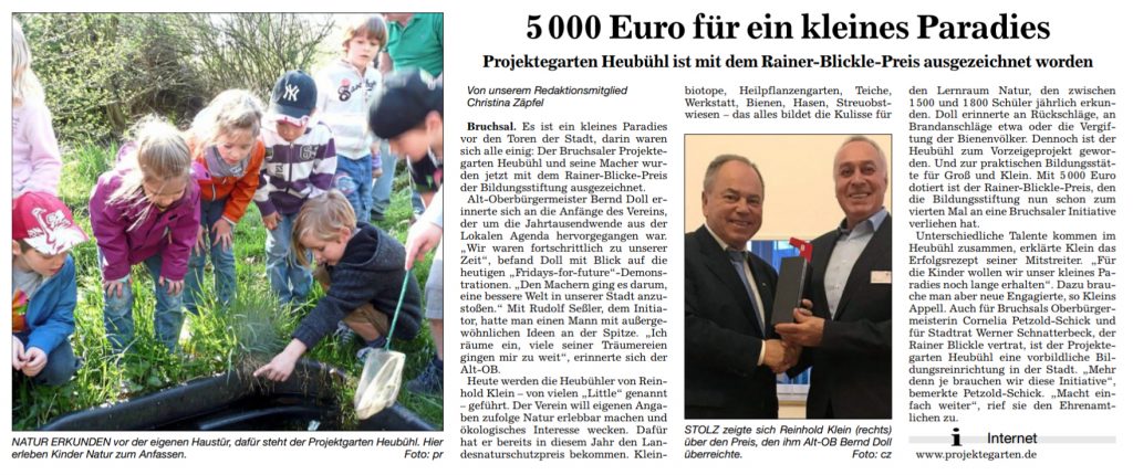 Am Montag, den 18.11.2019 wurde unser Projektegarten mit dem Rainer-Blickle-Preis der Bildungsstiftung Bruchsal ausgezeichnet. Der nach dem Stifter und Kurationsvorsitzenden der Bruchsaler Bildungsstiftung benannte und mit 5000 € dotierte Preis wurde nun schon zum vierten Mal an ein besonders erfolgreiches, innovatives Bildungsprojekt aus Bruchsal verliehen. „Zweck der Stiftung ist die Förderung von Bildung, besonders im schulischen Bereich, sowie von Wissenschaft und Forschung“ wie es auf der Webseite der Bildungsstiftung heißt. Überreicht wurde diese Auszeichnung durch Alt-Oberbürgermeister Bernd Doll, der an die Anfänge des Projekts als Teil einer Agenda-21-Bewegung erinnerte und dieser im Hinblick auf die „Fridays-for-future“-Demonstrationen frühes fortschrittliches Denken bescheinigte. Auch Oberbürgermeisterin Cornelia Petzold-Schick und Stadtrat Werner Schnatterbeck, der Rainer Blickle vertrat, würdigten unser Projekt als vorbildliche Bildungseinrichtung in der Stadt. Wir freuen uns sehr über diese Ehrung und bedanken uns bei der Bildungsstiftung Bruchsal als Stifter dieser Auszeichnung.